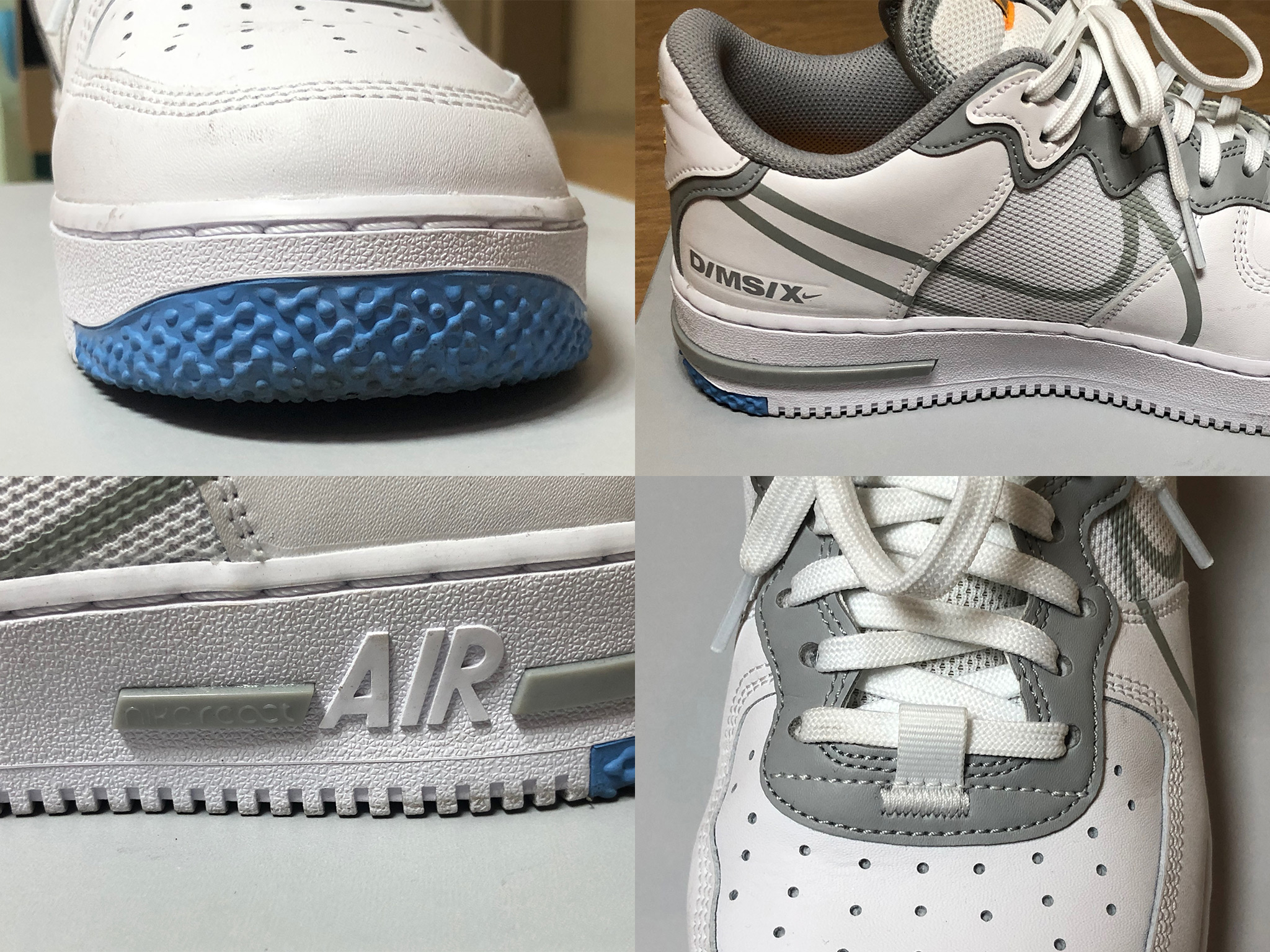 - 발 바깥쪽 AIR 로고 왼쪽에 자세히 보지 않으면 못 알아챌 정도로 옅은 나이키 리액트 로고가 추가됐다.